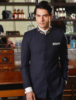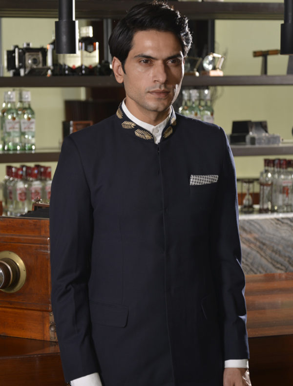 Bandhgala in blue colour fabric looks classy.Embroidery on its collar enhancing beauty of the Bandhgala. Looks fusion of classic and rich.combine with band collar pin tuck shirt with cufflinks.