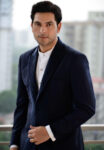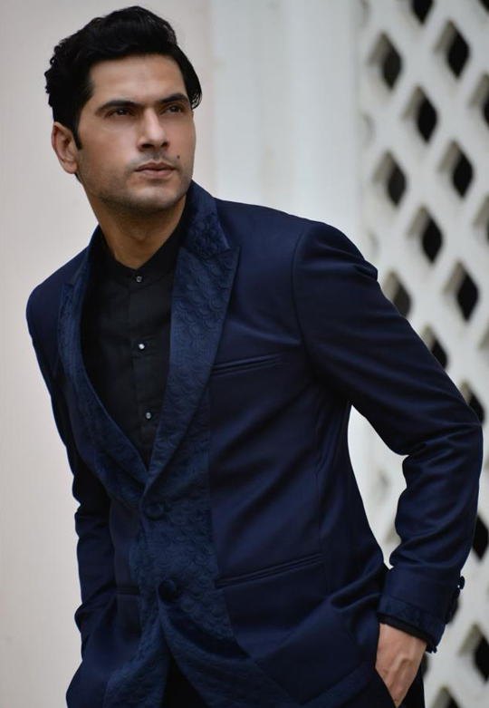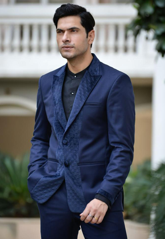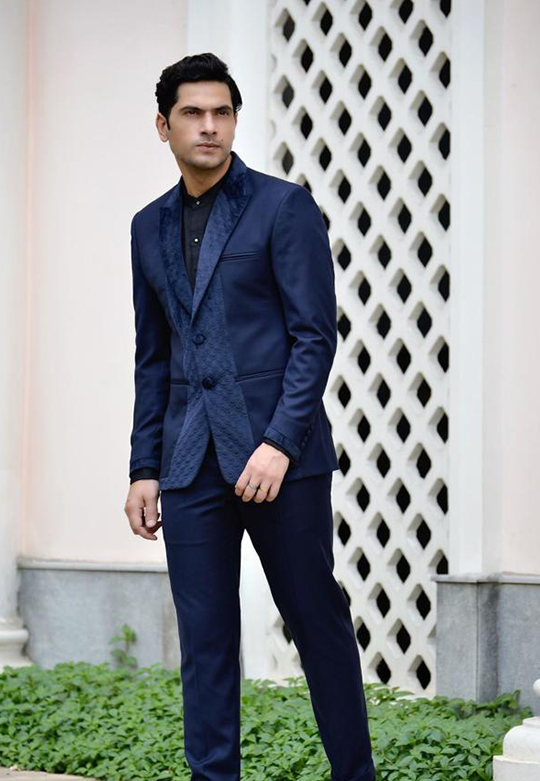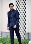 Blue colour blazer with matching blue colour velvet patch pattern design on it.combined with black/white shirt and a matching blue colour trouser.