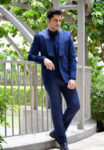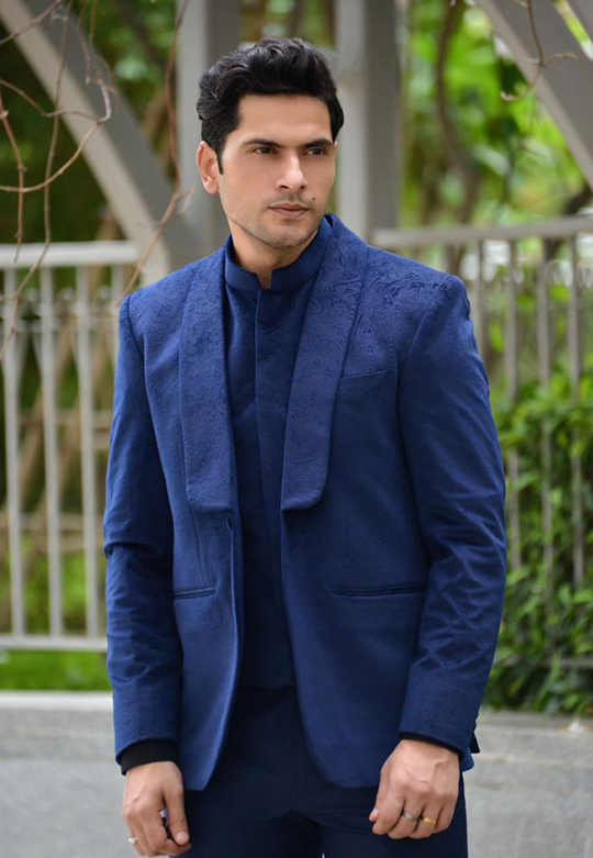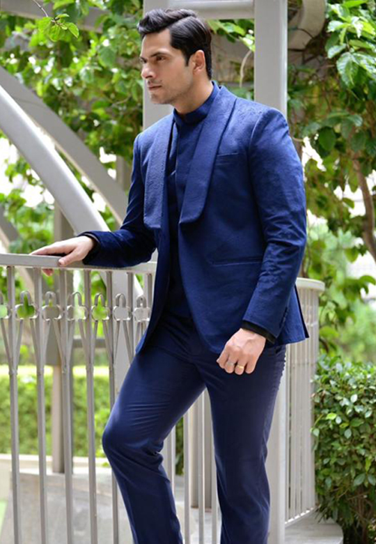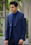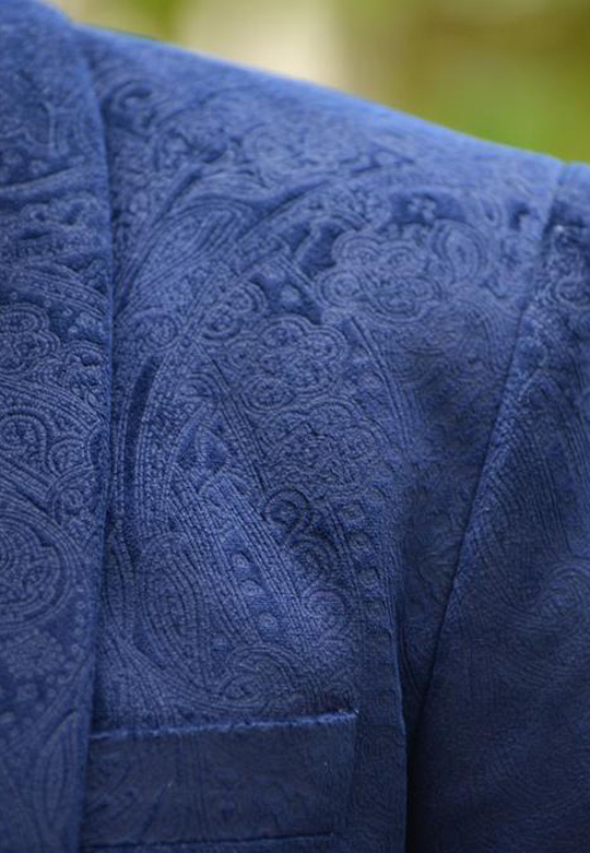 Paisley print blue velvet three piece suit combined with black shirt and matching blue trouser.