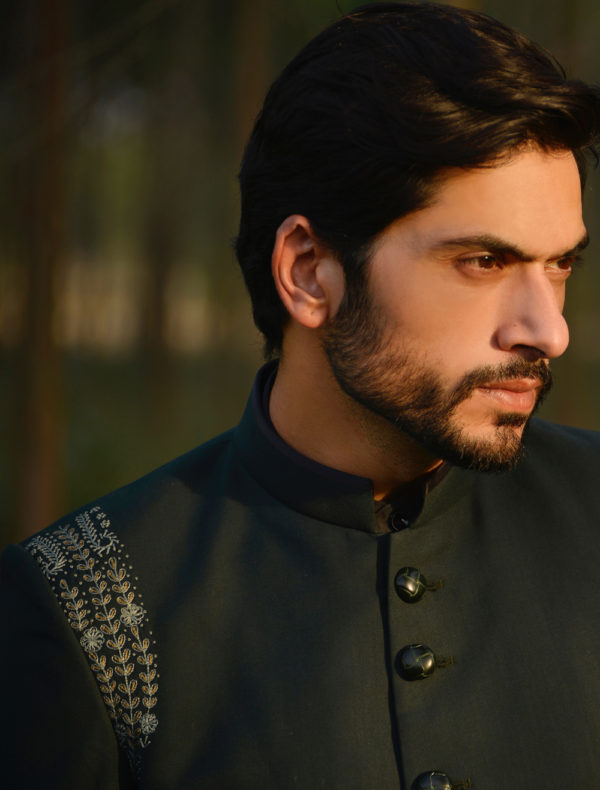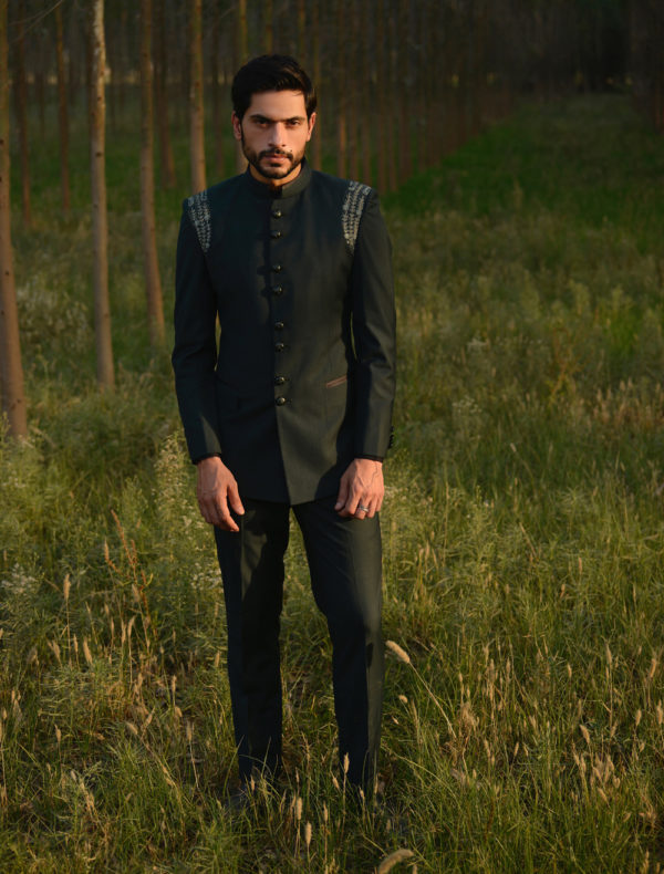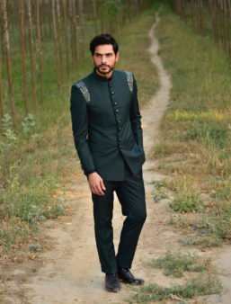 Bottle green colour Soft light weighted fabric for men’s suiting suitable for all the seasons.Beautiful bottle green vibrant colour having hand embroidery over the shoulders, enhancing the beauty of the suit.Embroidery looks so neat and yes it’s all hand work.combine with black colour band collar pin tuck shirt with cufflinks.