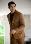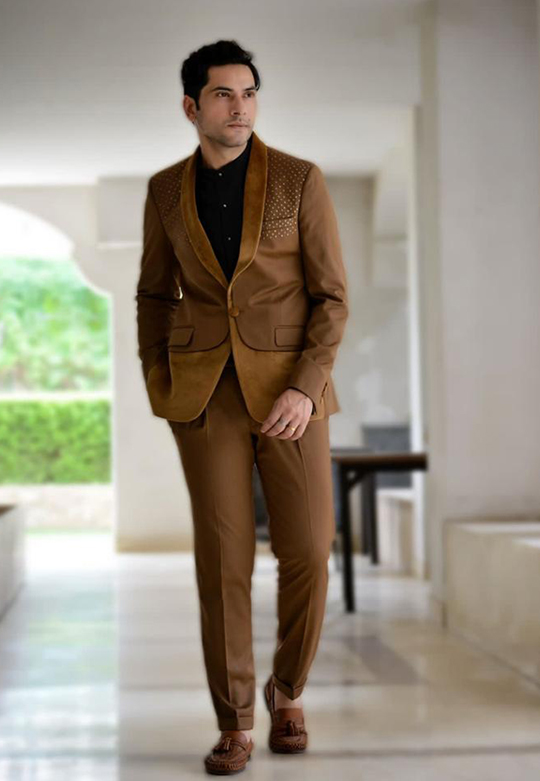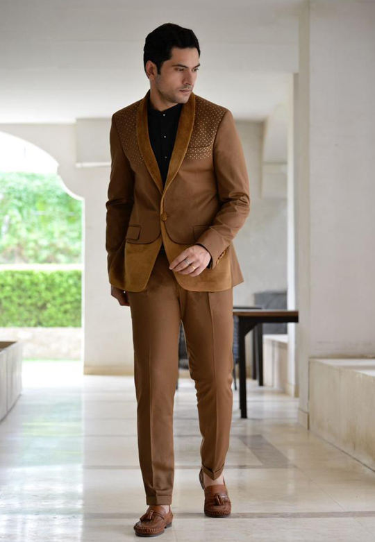 Brown colour single button blazer having embossed velvet detailing on lapel and front bottom. Beautiful studs on mid front of the blazer,combined with black shirt and matching brown colour trouser.
