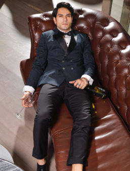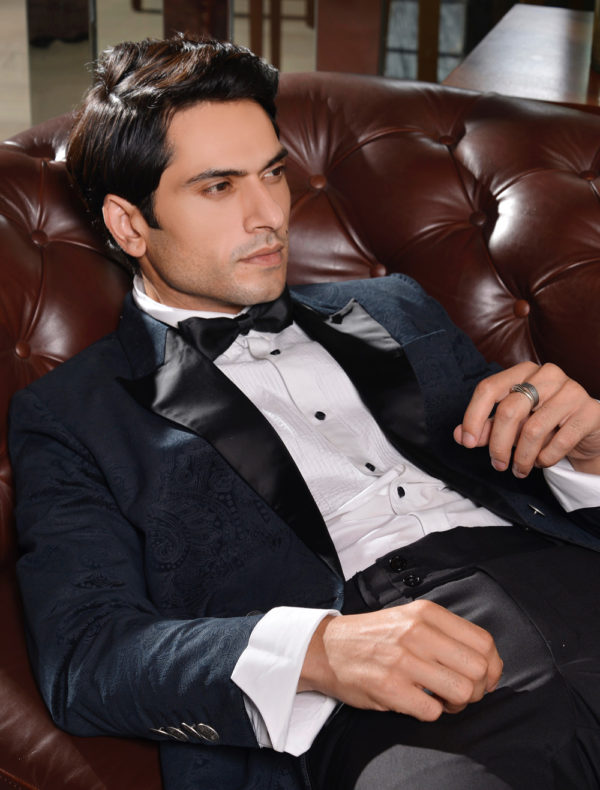 Soft velvet fabric double breast tuxedo is updated for a modern take on a classic look.black colour fine suiting fabric trouser with details of broad waist band.Band collar pin tuck shirt with cufflinks.