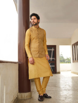 It’s a Banarasi jute fabric Nehru jacket.Print on Banarasi Jute is giving a graceful look to the jacket.Combine with matching colour pure silk cheddar kurta pyjama.