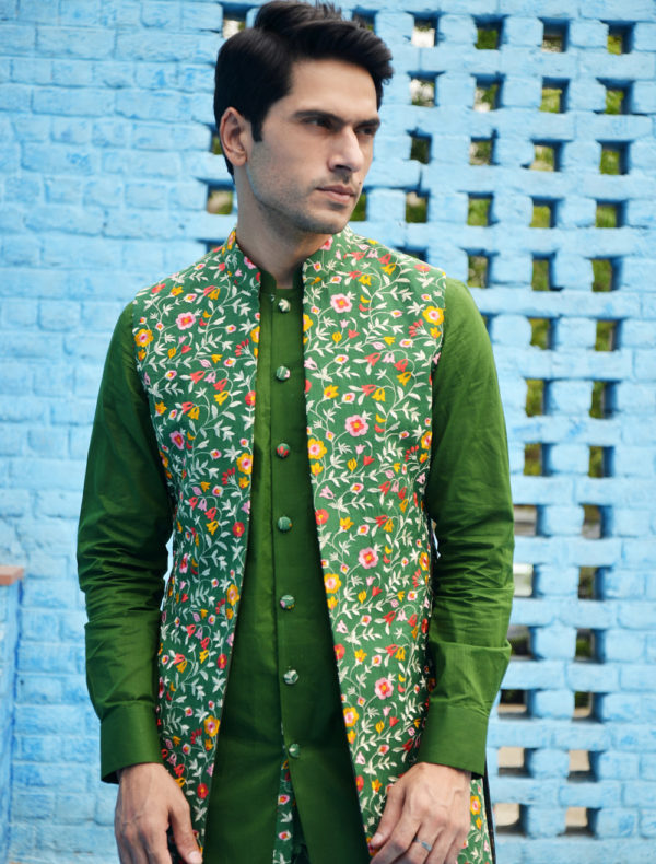 Indowestern nehru jacket with base green colour having coloured floral embroidery .combination with matching green front open kurta and pyjama.kurta buttons highlighted with floral fabric and with cufflinks