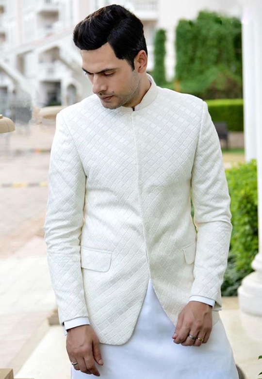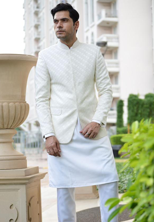 Ivory white Thread embroidered fabric prince coat styled with kurta pyjama