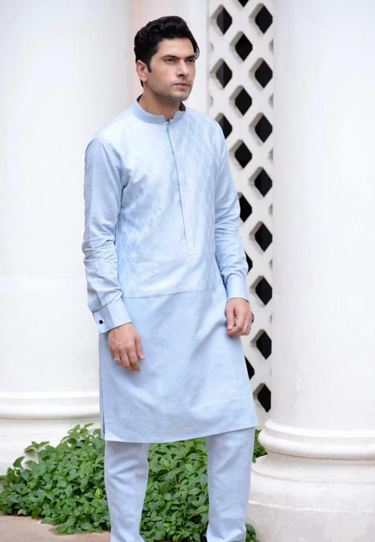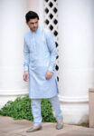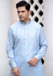 Powder blue colour kurta pyjama having patch of matching colour jacquard fabric.styled with cufflinks.