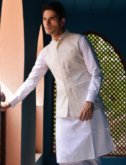 Base white colour nehru jacket with sequence work.combining with matching white colour kurta pyjama with cufflinks.